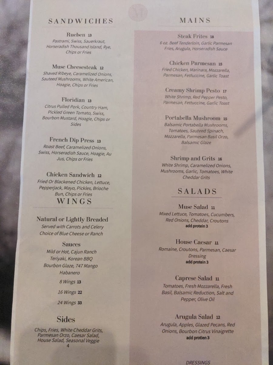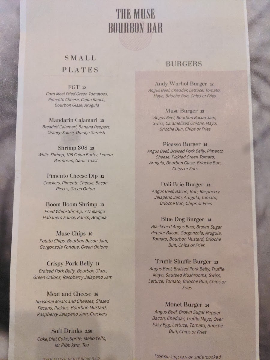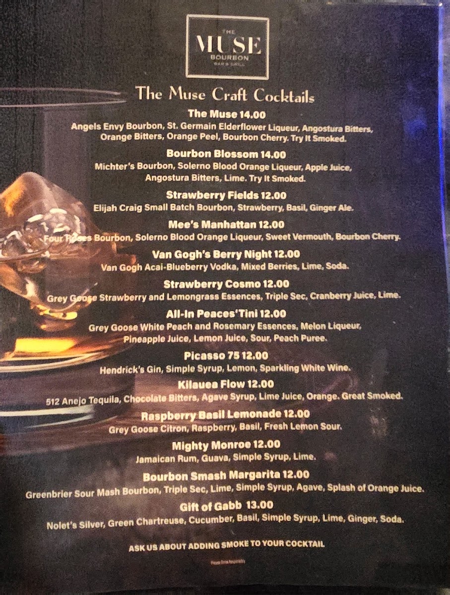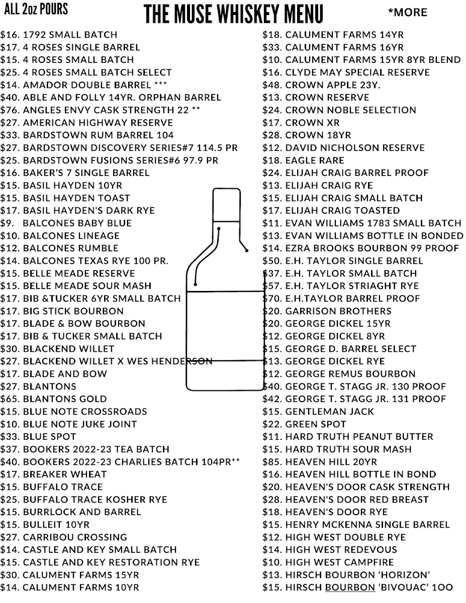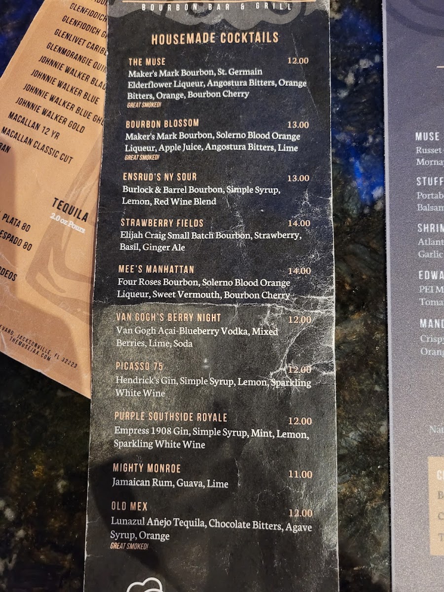 Introducing the menu at The MUSE Bourbon Bar & Grill, located in Jacksonville, FL, is a delightful experience for food and bourbon enthusiasts alike. From the moment you step inside, the vibrant atmosphere captivates, enhanced by live music and artistic decor. The food offerings are a cut above typical bar fare, featuring dishes named after artists, which adds a unique flair to your dining experience.